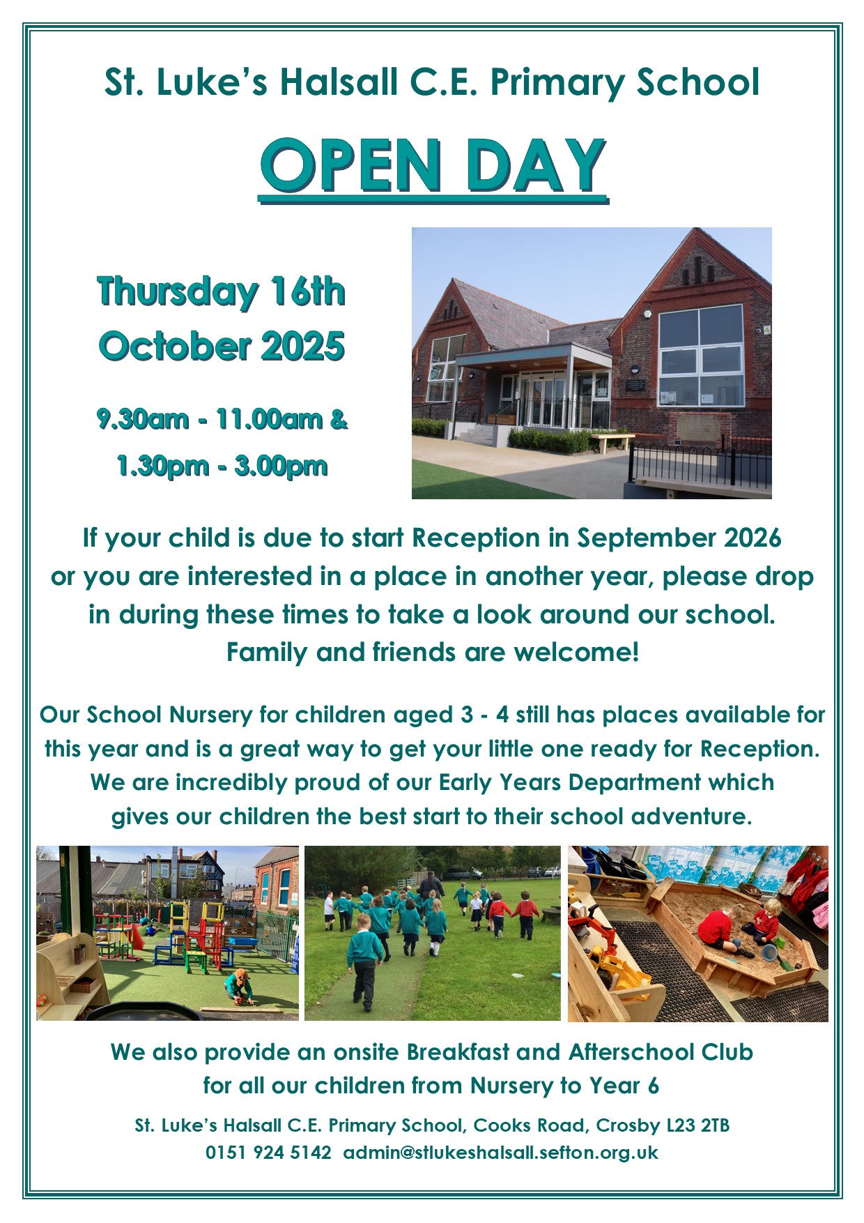 We are holding our annual Open Day on Thursday 16th October 2025. School will be open for visitors from 9.30am-11.00am and 1.30pm-3.00pm. Please just drop in during these times to take a look around - there is no need to book!
